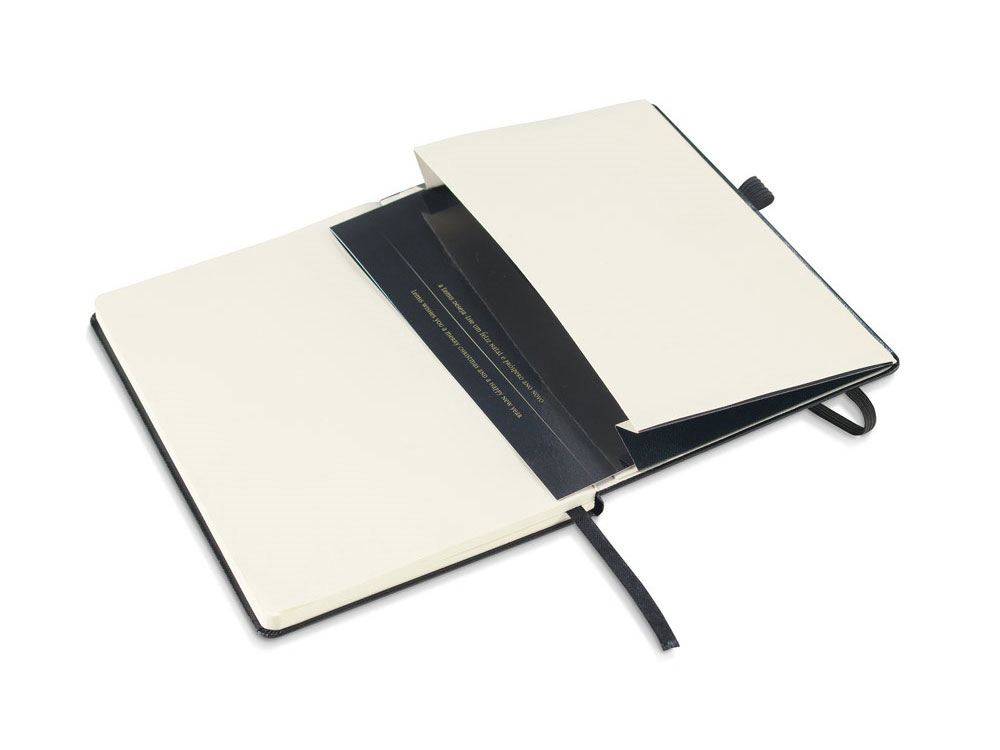 Блокнот формата A5 на 160 чистых страниц цвета слоновой кости, твердая обложка, внутренний карман, разделительная лента, резинка и имеет держатель для шариковой ручки (ручка в комплекте).