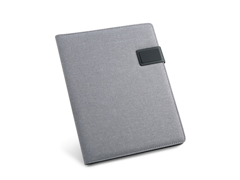 Папка A4 из искусственного льна и кожзаменителя. Имеет застежку на магните с пластинкой для персонализации. Внутри имеет блокнот из 20 листов в линейку, держатель для шариковой ручки (ручка не входит в комплект), карман для смартфона и держатели для кабелей или других принадлежностей (в комплект не входят). 233 x 310 x 18 мм | Пластина: 50 x 30 мм. Вид нанесения, рекомендуемый поставщиком: трансфер, гравировка.