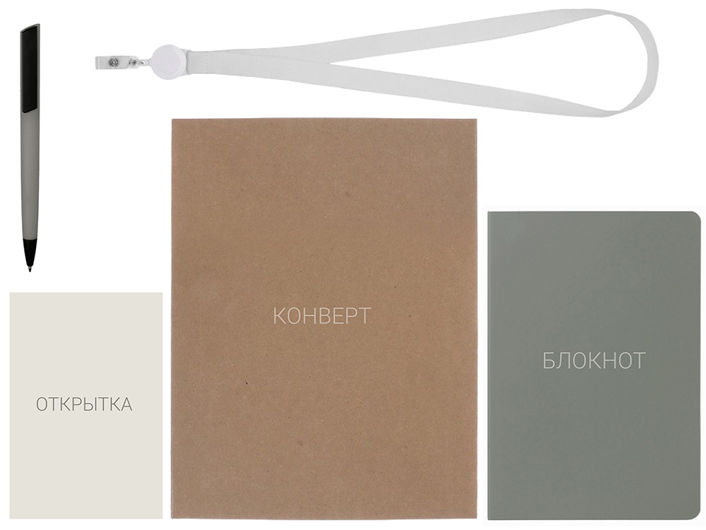 Материал: блокнот - искусственная кожа, открытка - бумага, пакет - картон, ручка - пластик с покрытием soft-touch, ланьярд с ретрактором - полиэстер, металл, пластик.