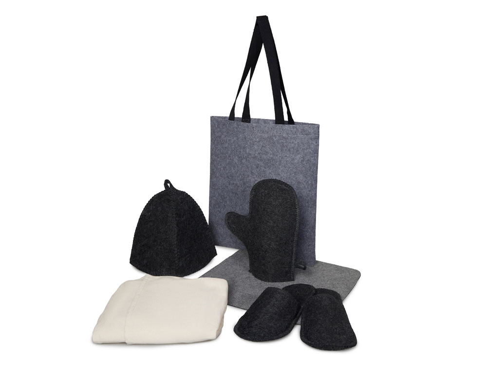 Женский банный набор Healing для комфортного отдыха: лежак для бани, холщовый килт-парео, рукавица, шапка и тапочки — всё аккуратно упаковано в стильный фетровый шоппер.