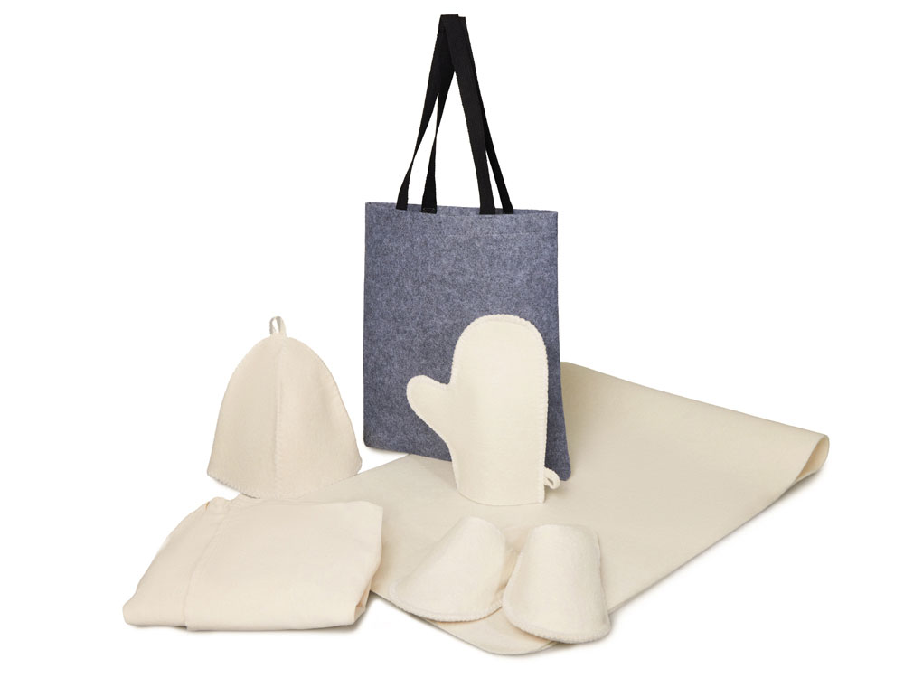 Банный набор Healing для настоящего ценителя сауны: коврик-лежак, мужской вафельный килт, рукавица, шапка, тапочки — всё в стильном фетровом шоппере.
