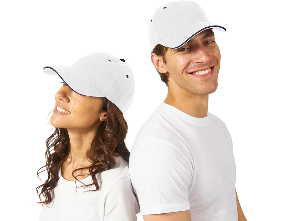 Бейсболка New Castle 6-ти панельная, белый/темно-синий с логотипом компании - отличный способ заявить вашу корпоративную идентичность.