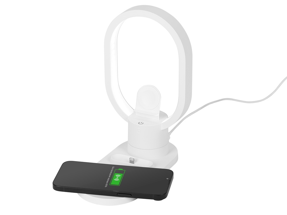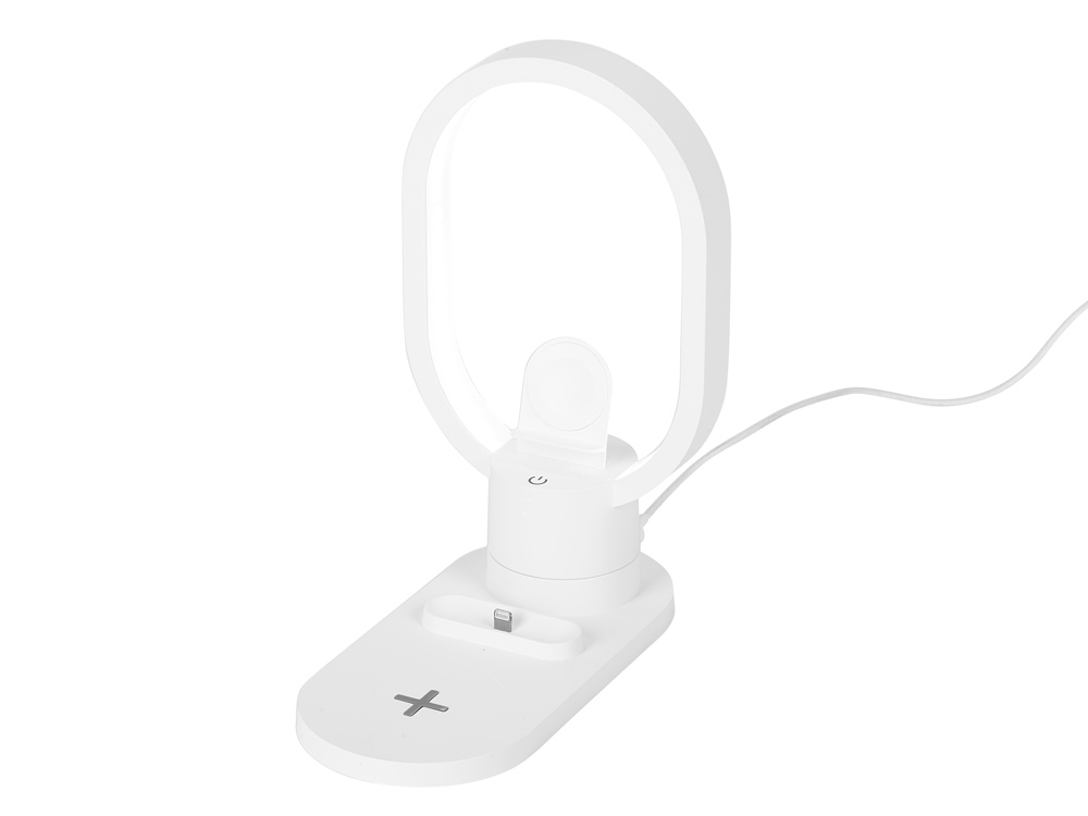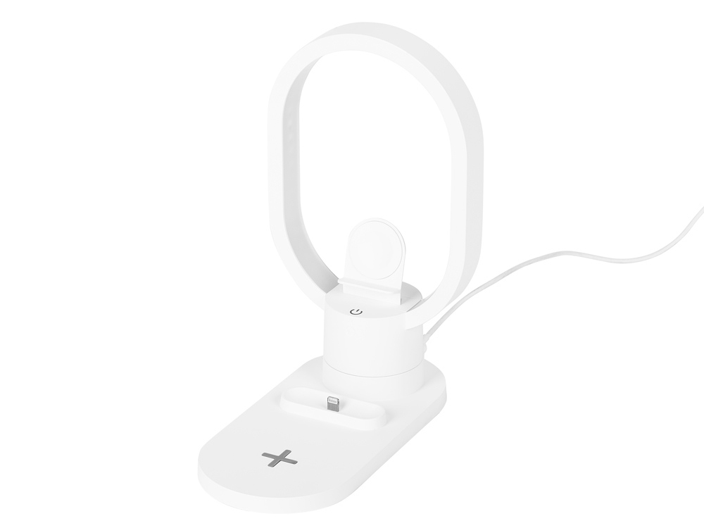 Настольная зарядная станция с лампой для трёх устройств - смартфона с поддержкой беспроводной зарядки, часов Apple и наушников Apple (разъем Lightning). Регулируемый уровень яркости (диммер). Лампу можно вращать вокруг своей оси. Для удобства транспортировки лампу можно отсоединить.
