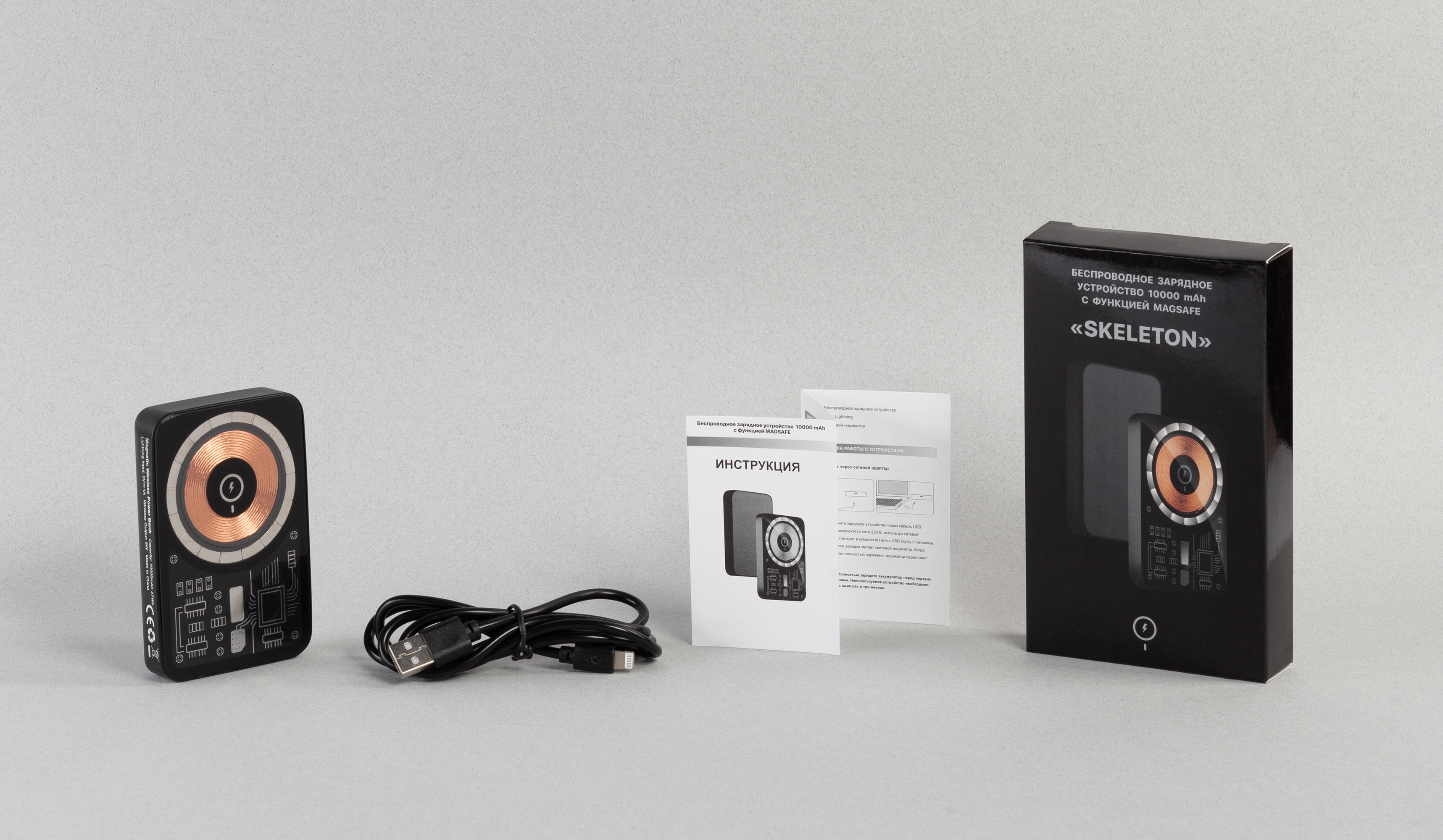 Металлический (алюминиевый) корпус с прозрачной лицевой стороной, открывающей взору зарядную катушку с магнитами MagSafe, позволяющими максимально удобно закреплять (примагничивать) Skeleton к iPhone 12-ой серии и выше.