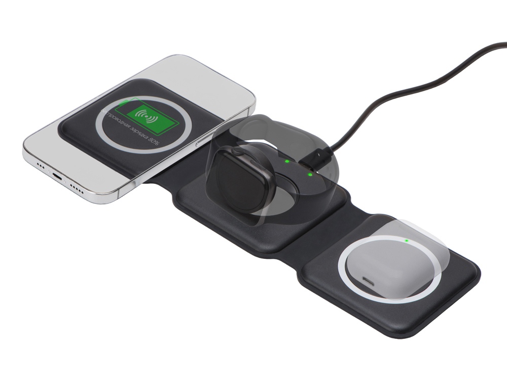 Беспроводная зарядная станция 3 в 1 — это современное решение для быстрой и удобной зарядки ваших устройств. Эта компактная и практичная модель позволяет заряжать сразу три устройства одновременно- любой смартфона и наушники с поддержкой беспроводной зарядки по протоколу Qi, и часы Apple.