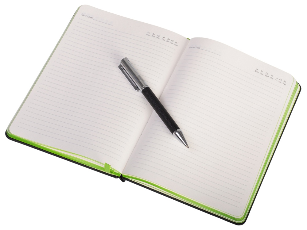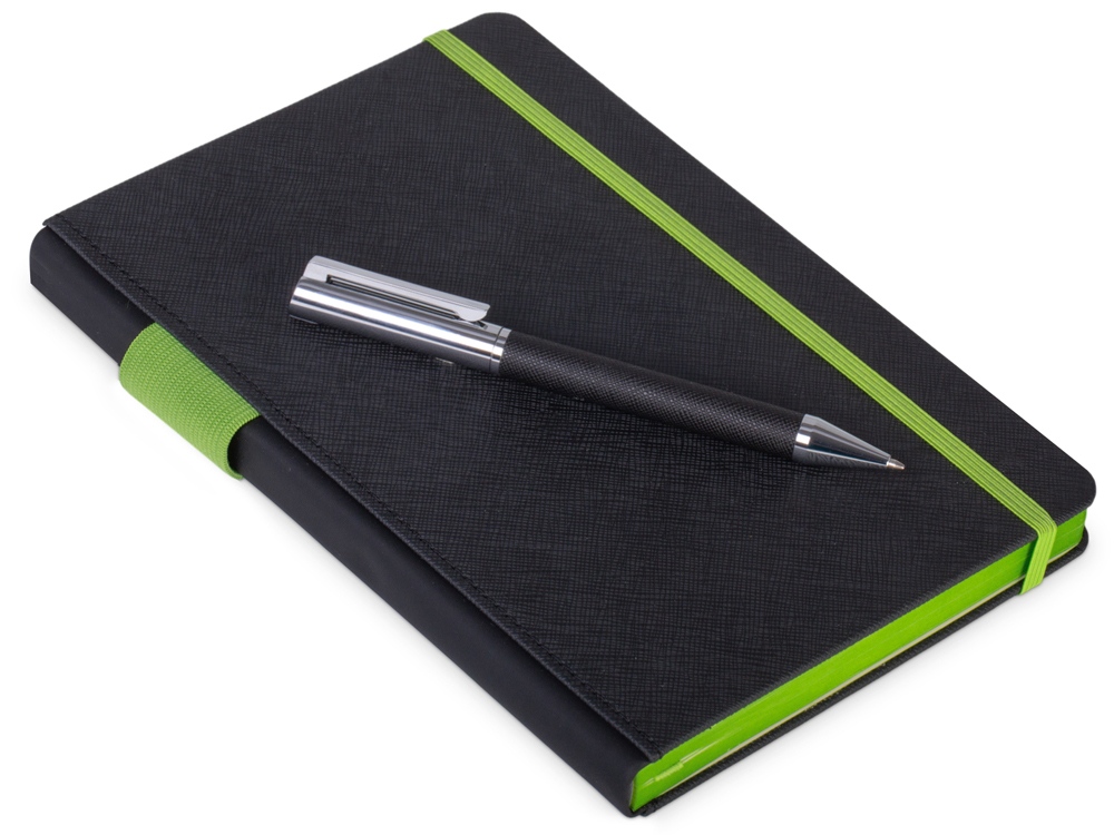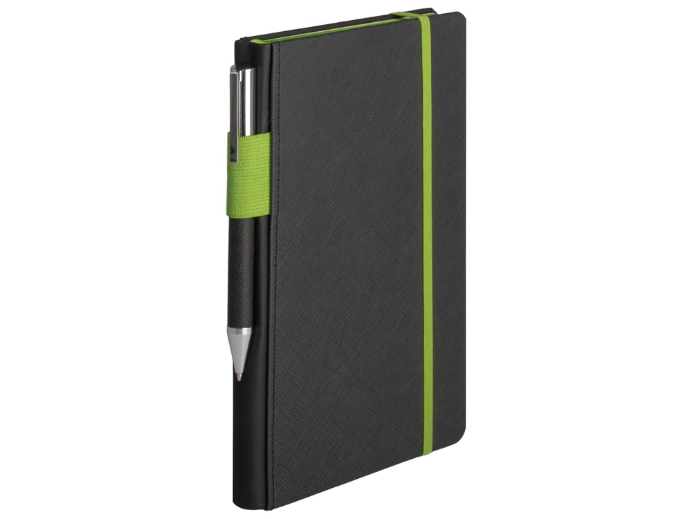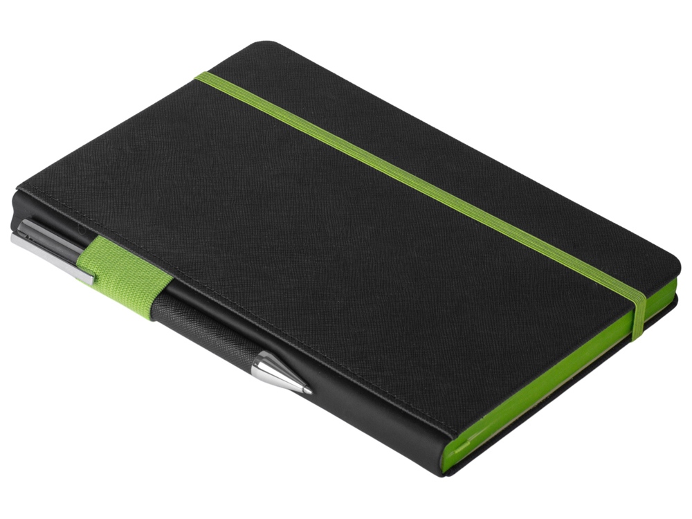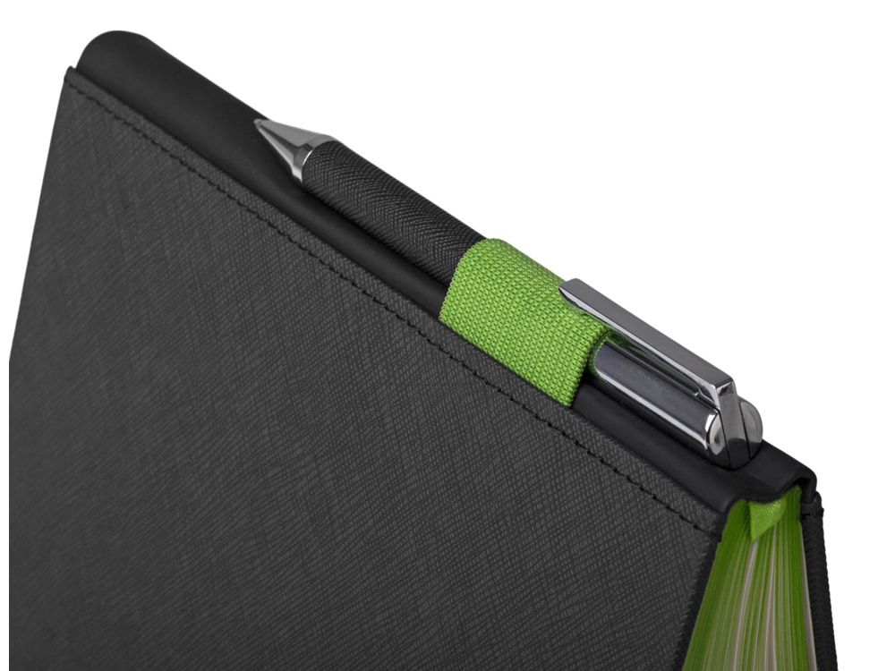 Бизнес блокнот Bossy с ручкой, черный и зеленое яблоко с логотипом компании - отличный способ заявить вашу корпоративную идентичность.