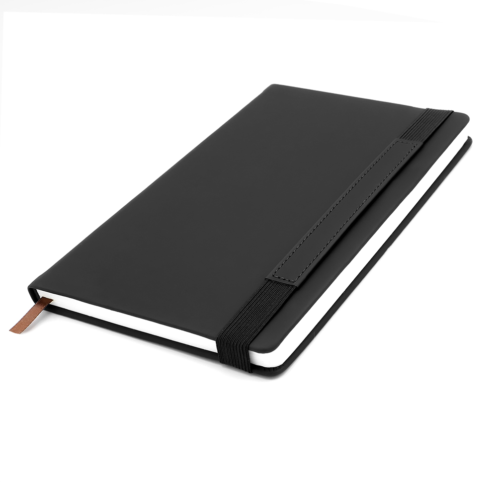 Блокнот формата А5 в твёрдой обложке из искусственной кожи. Материал обложки — термополиуретан, текстура — гладкая. Из особенностей: широкая эластичная застёжка со вставкой из кожзама. На неё можно нанести логотип либо слоган вашей компании.