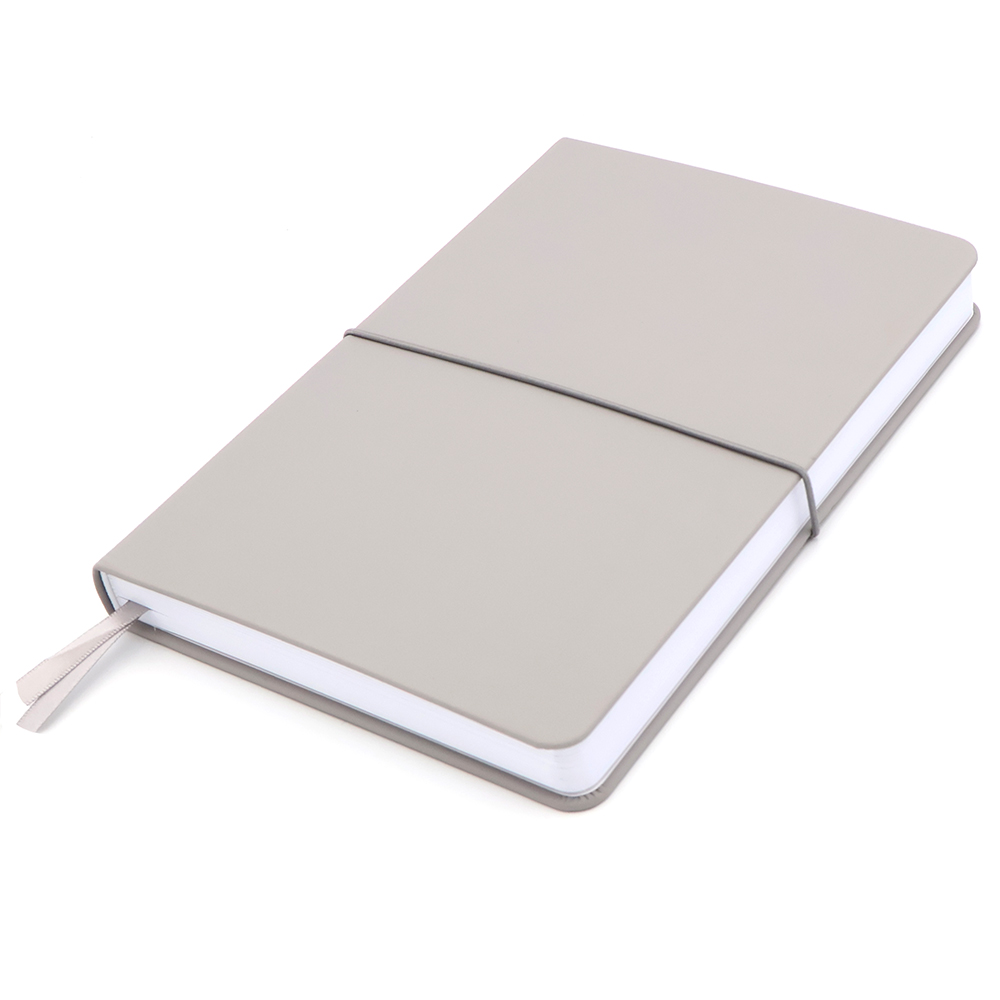 Блокнот А5-формата жёсткой обложке со специальным гладким покрытием. Материал обложки — полиуретан. Карман в нахзаце, форзац, двойное ляссе, эластичная застёжка — всё комплиментарно цвету обложки.