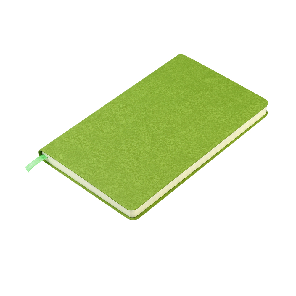 Блокнот формата А5 с мягкой обложкой из PU-материала, имеющего текстуру, имитирующую поверхность натуральной кожи; с текстильной закладкой в цвет блокнота, 256 страниц, плотность 70г/м, страницы с черными линиями. Цвет по PANTONE® (максимально приближен): 2276C.