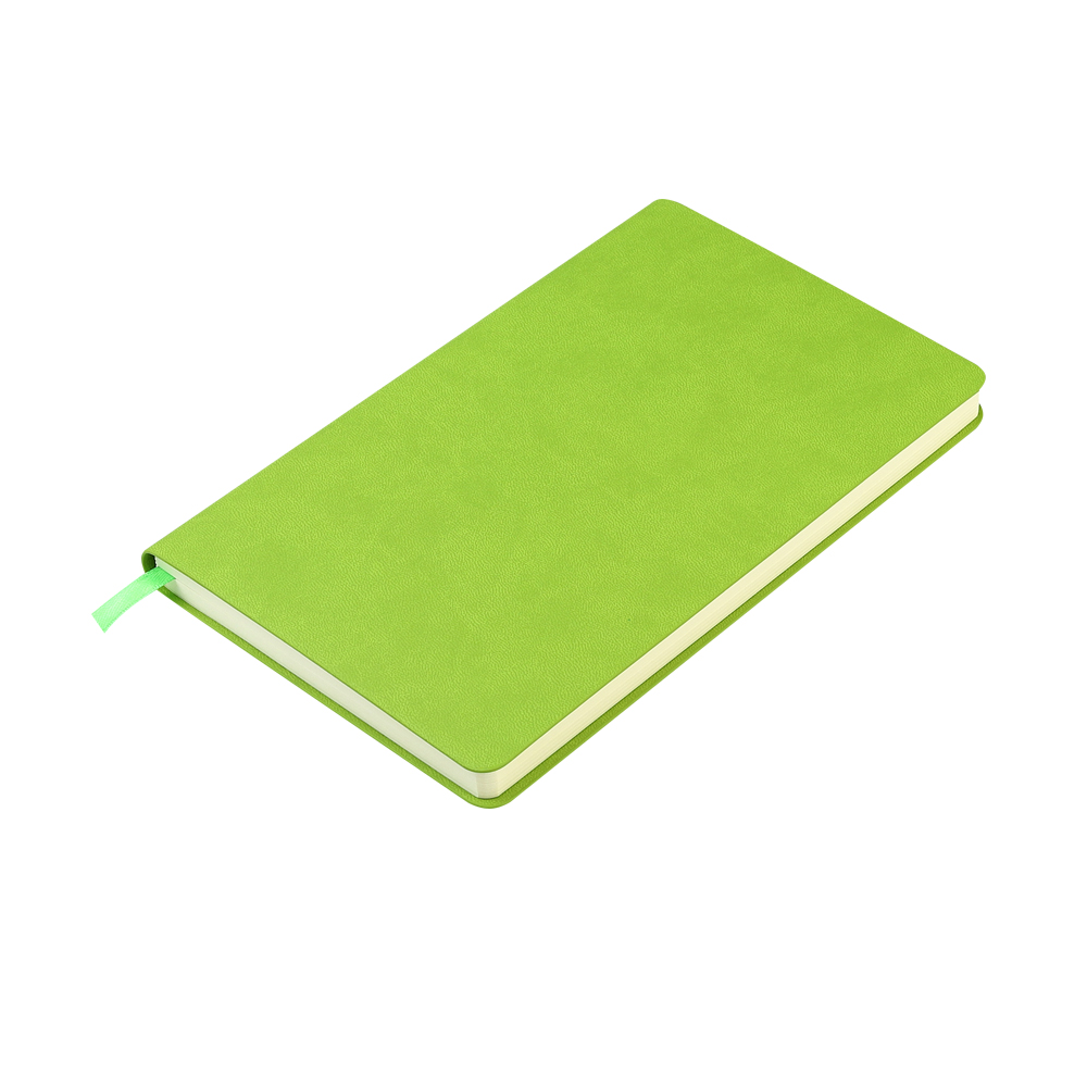Блокнот формата А5 с мягкой обложкой из PU-материала, имеющего текстуру, имитирующую поверхность натуральной кожи; с текстильной закладкой в цвет блокнота, 256 страниц, плотность 70г/м, страницы с черными линиями. Цвет по PANTONE® (максимально приближен): 368C.