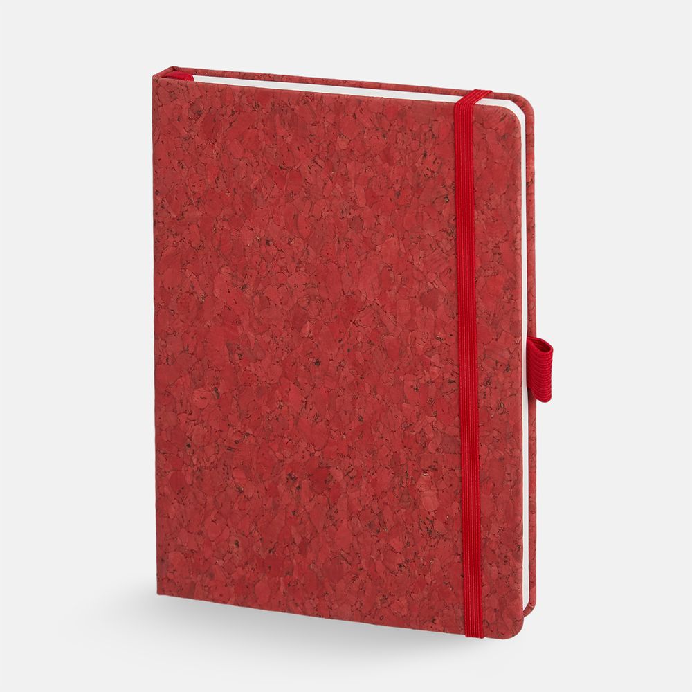 Блокнот с твердой обложкой из натуральной окрашенной пробки, дополнен петлей-резинкой для ручки, ляссе и резинкой в цвет обложки.