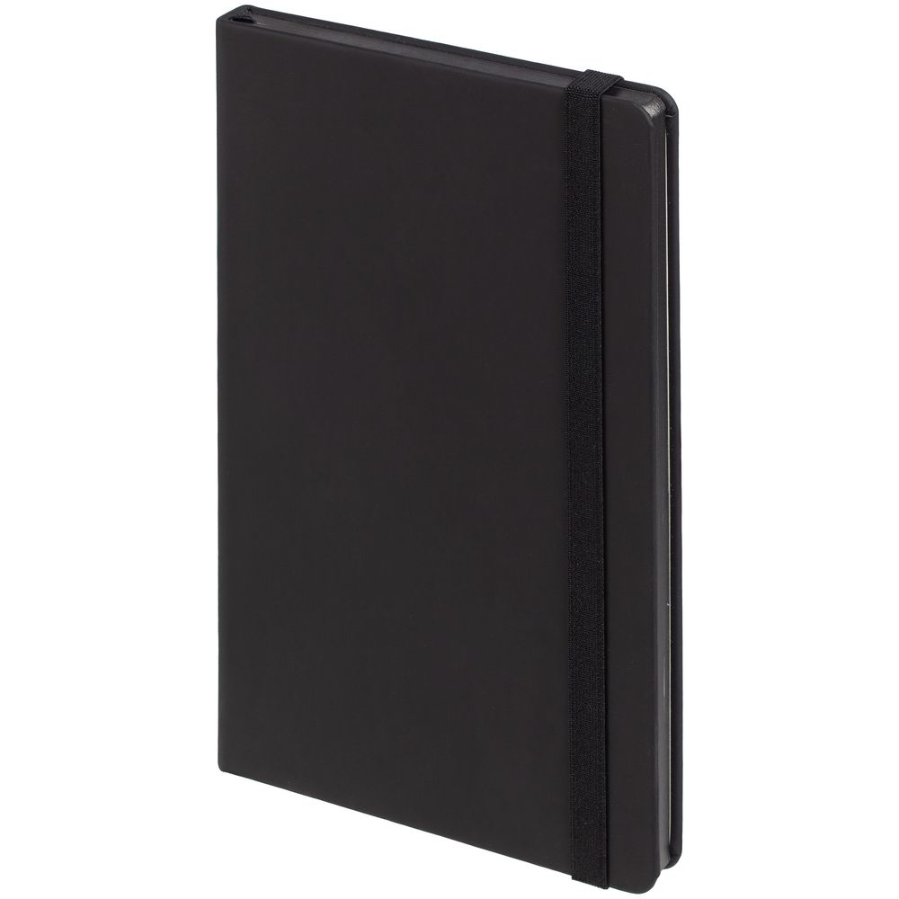 Блокнот в твердой обложке, выполнен из материала Soft Touch, черный АА, дополнен резинкой и ляссе в цвет обложки.