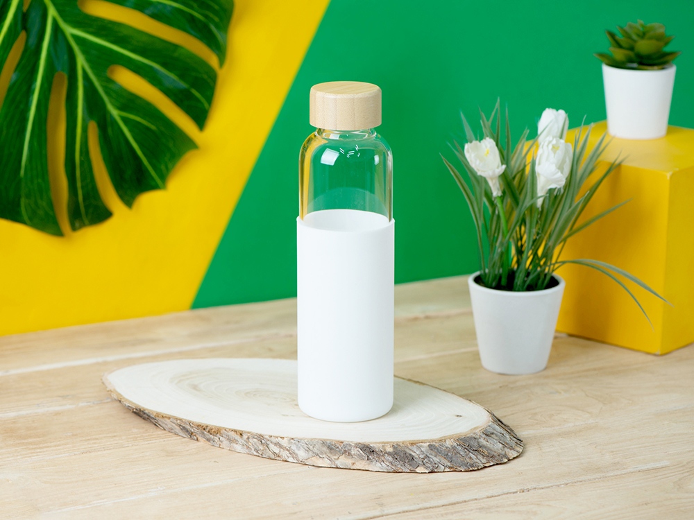 Бутылка для воды стеклянная Refine, в чехле, 550 мл, белый с логотипом компании - отличный способ заявить вашу корпоративную идентичность.