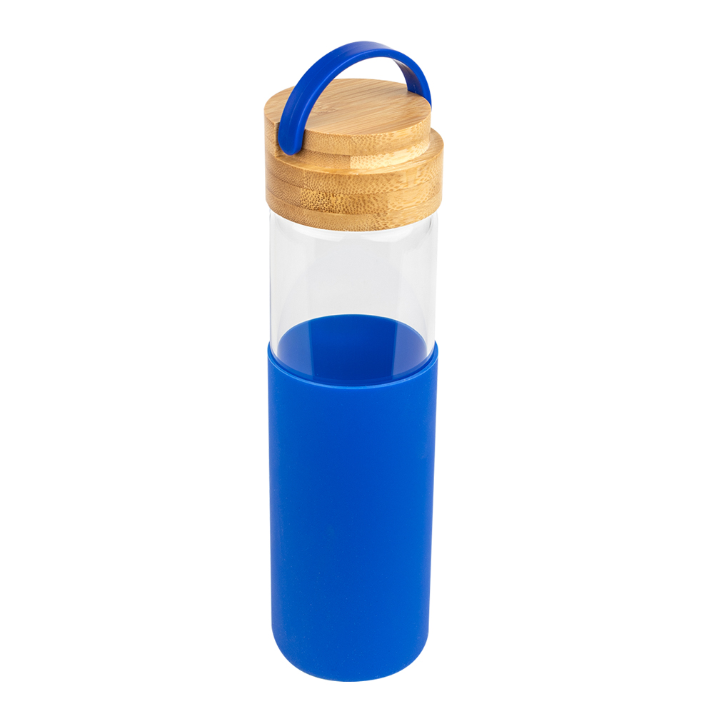 Главная ->Корпоративные подарки и рекламные сувениры на складе -> Термос и бутылка -> Термосы и бутылки -> Бутылка стеклянная с силиконовой манжетой и бамбуковой крышкой Glass, синяя
