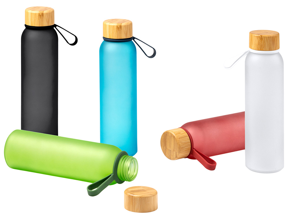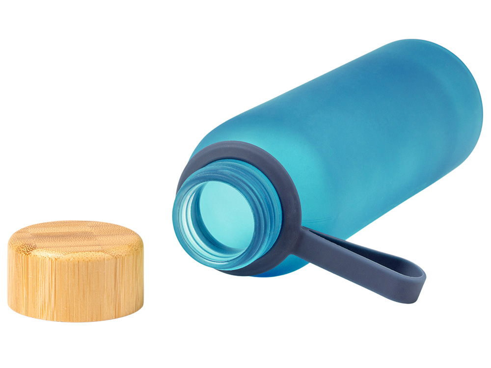 Полупрозрачная бутылка из переработанного стекла. Бамбуковая крышка с держателем. Объём: 500 мл. Поставляется в индивидуальной коробке.