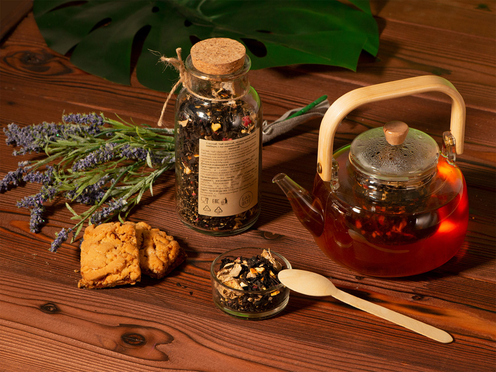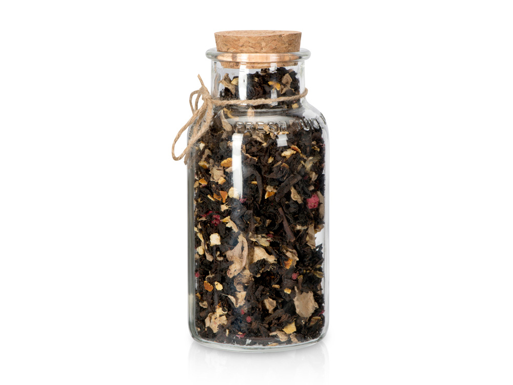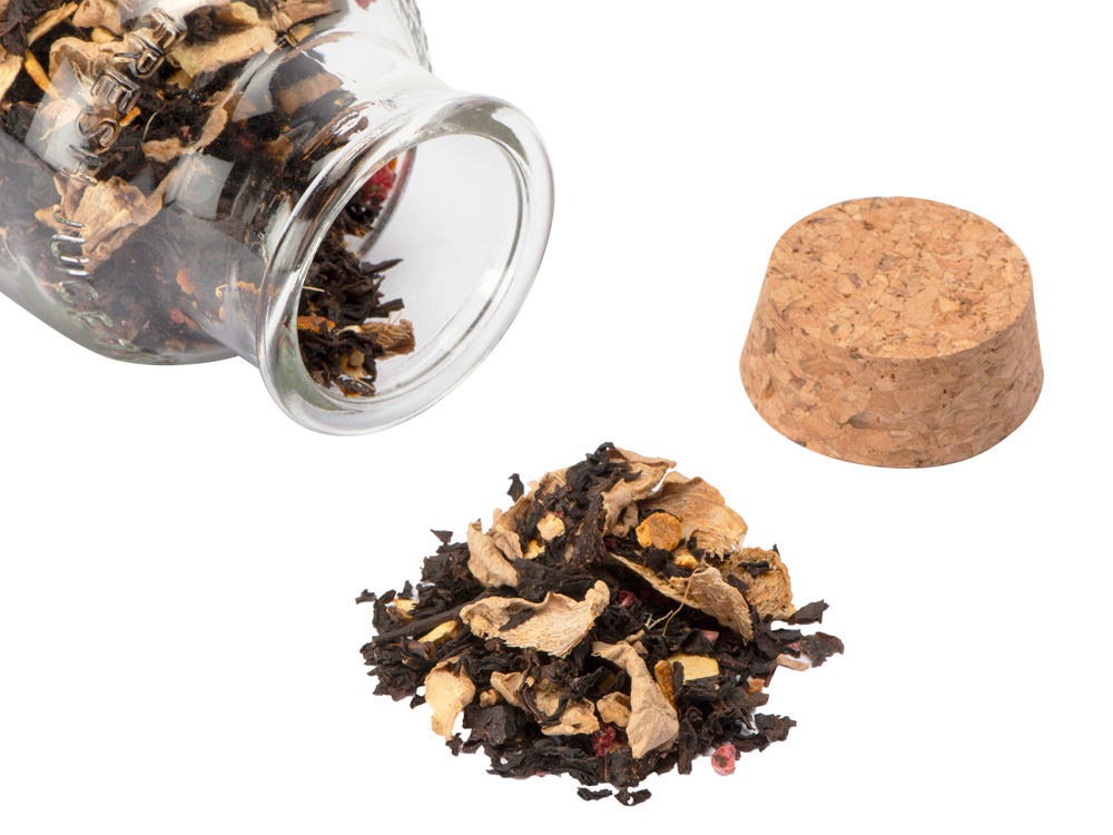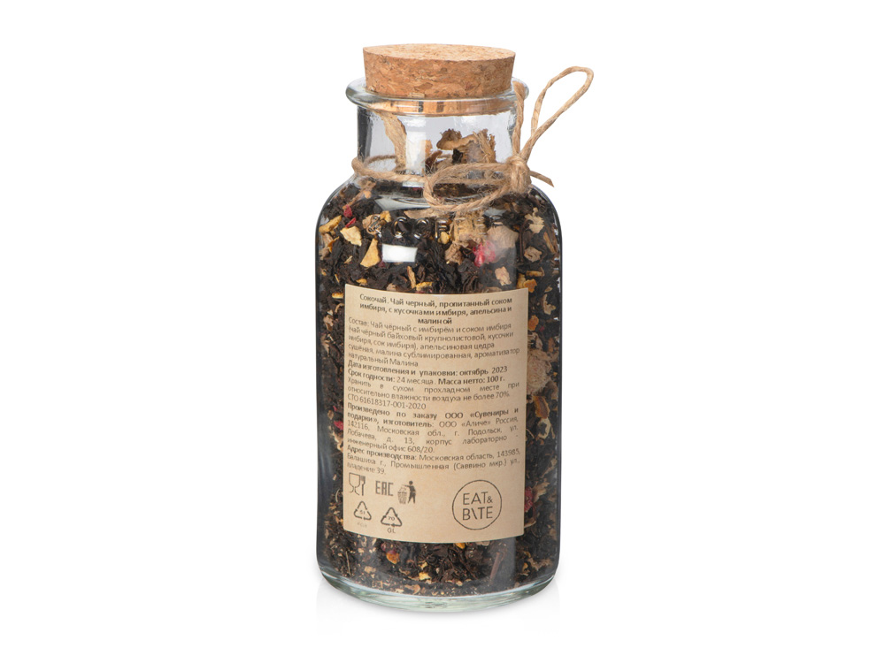 Чай черный, с соком имбиря, кусочками апельсина и малины, 100г с логотипом компании - отличный способ заявить вашу корпоративную идентичность.