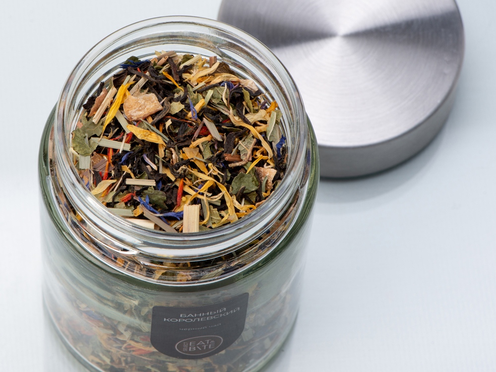 Чай черный, серия Essence, банный королевский, стеклянная банка с логотипом компании - отличный способ заявить вашу корпоративную идентичность.