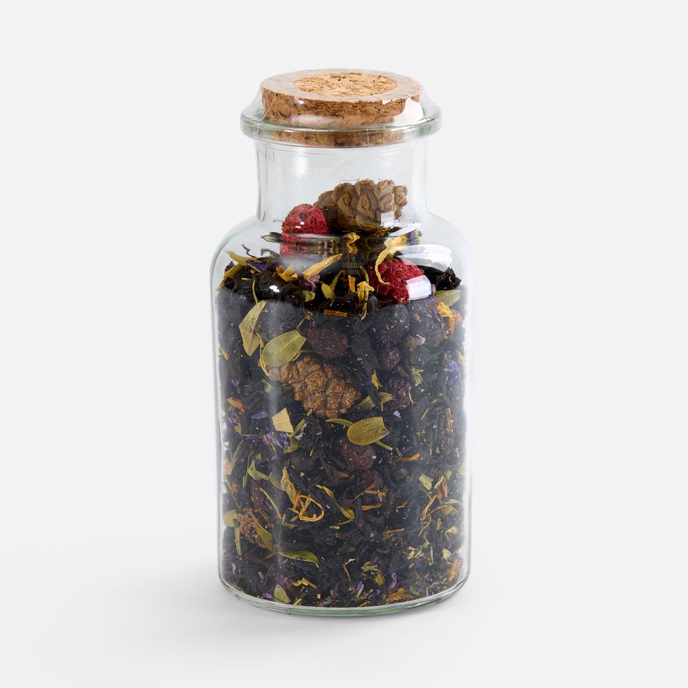 За ягодный вкус отвечают сублимированные малина и смородина, усиленные ароматом черной смородины. Лепестки календулы и мальвы придают настою солнечный оттенок и цветочное послевкусие. Идеальный баланс между тонизирующим эффектом и ягодной сладостью.Состав: чай черный, плоды боярышника, клюква, листья брусники, плоды можжевельника, мята, сосновые шишки, розмарин, листья саган-дайля, лепестки календулы, малина, сублимированная, красная смородина сублимированная, цветки мальвы, ароматизатор «Черная смородина».
