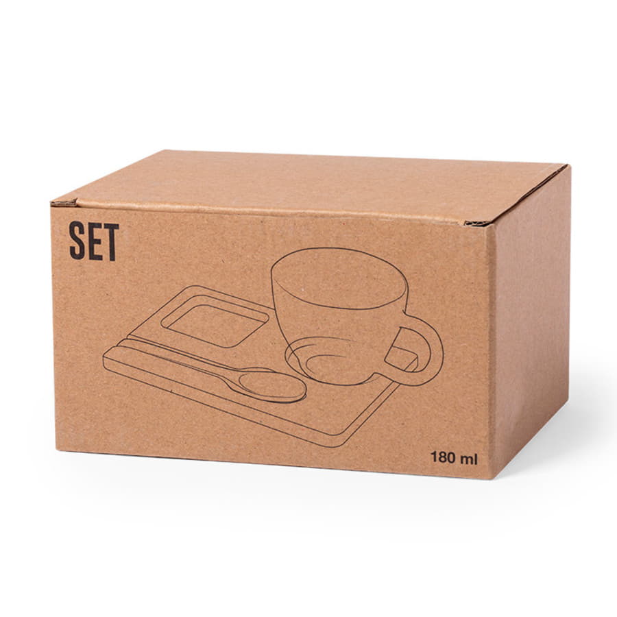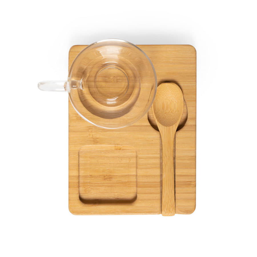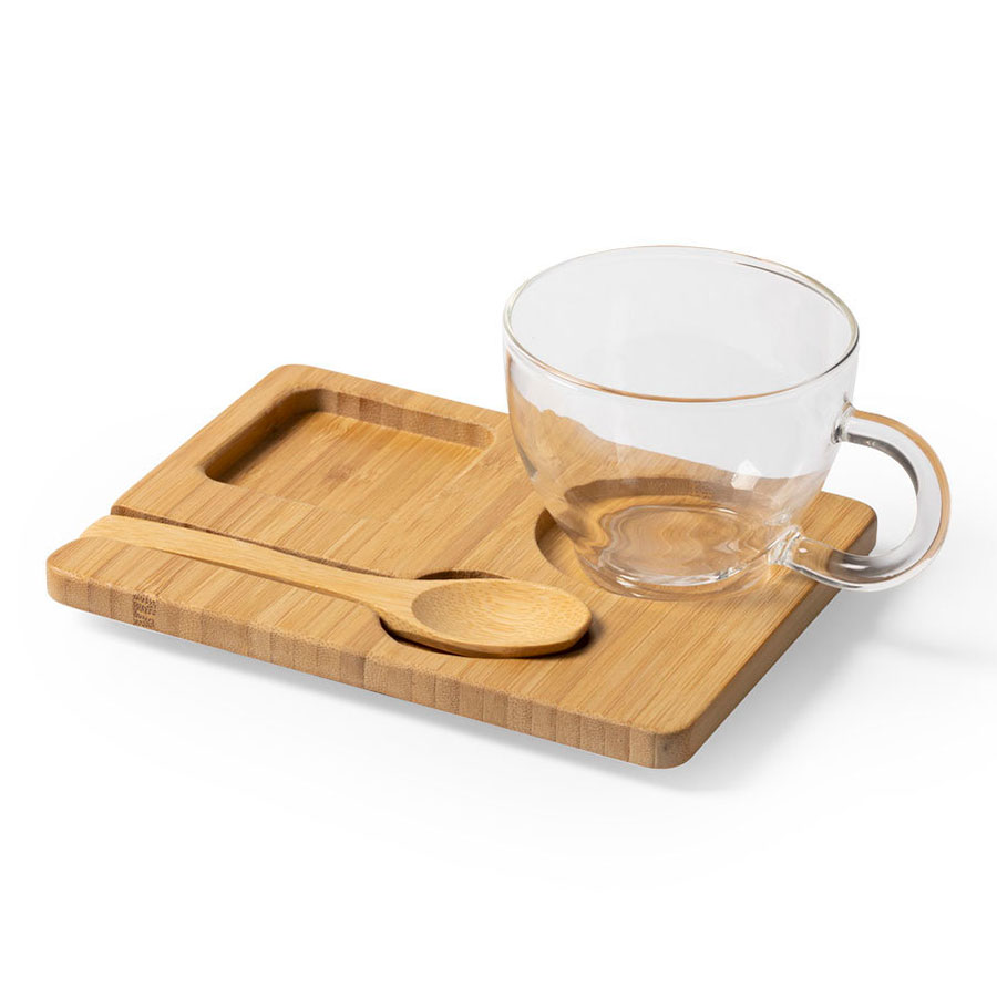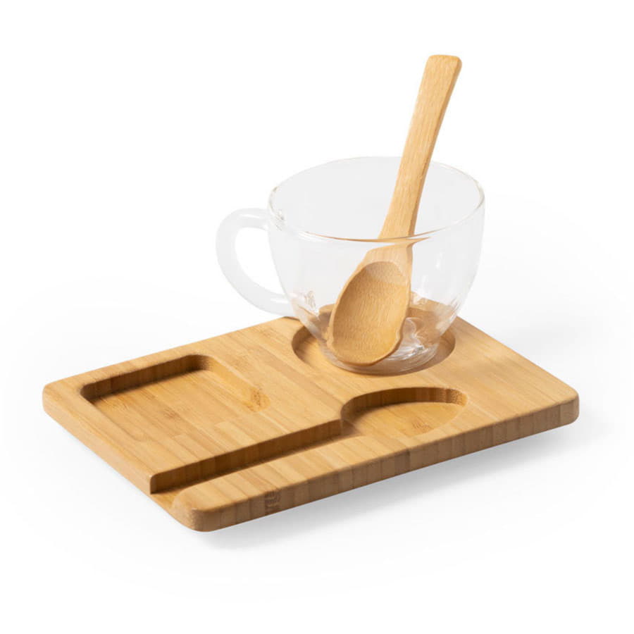 Чашка сделана из боросиликатного стекла, ложка и поднос изготовлены из бамбука.