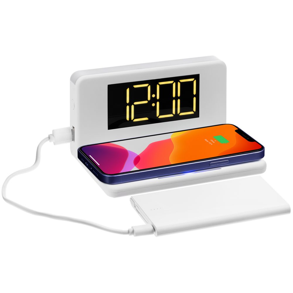 Компания «Эклектика BY» осуществляет нанесение логотипа на сувенирную продукцию: Часы настольные с беспроводным зарядным устройством Pitstop, белые. Арт. 121396