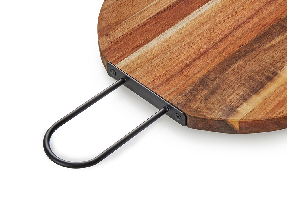 Деревянная круглая доска из акации с металлической ручкой Кира с логотипом компании - отличный способ заявить вашу корпоративную идентичность.