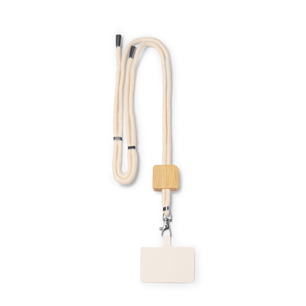 Хлопковый держатель для мобильного телефона со шнуром, с бамбуковой деталью и системой регулировки.