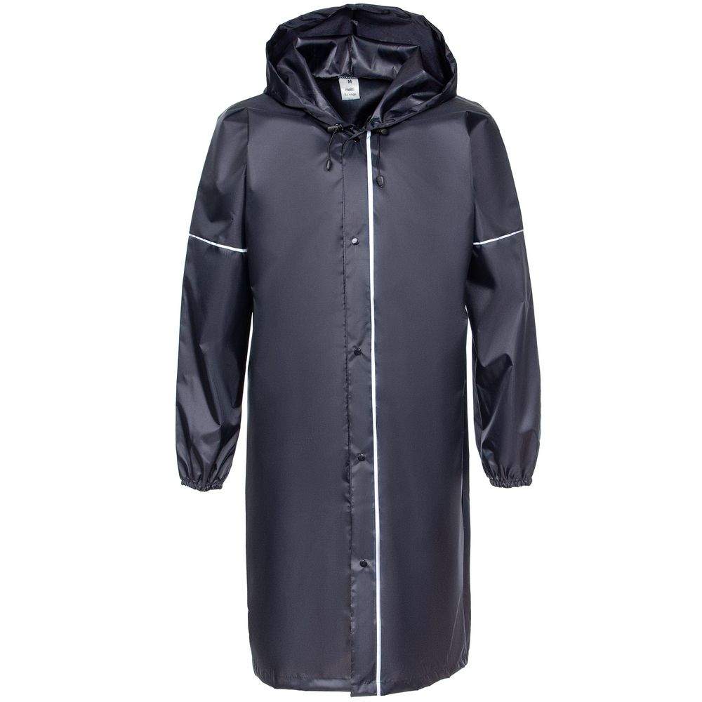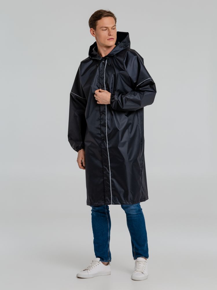 Плащ-дождевик из ткани оксфорд на кнопках с капюшоном. Световозвращающие элементы на рукавах и планке позволяют быть замеченным в темное время суток.