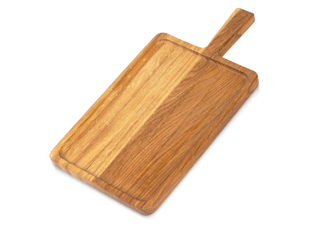 Доска обладает углублением и небольшими бортиками для стока жидкости из нарезаемых продуктов. Благодаря ручке её удобно использовать в качестве подноса или блюда.