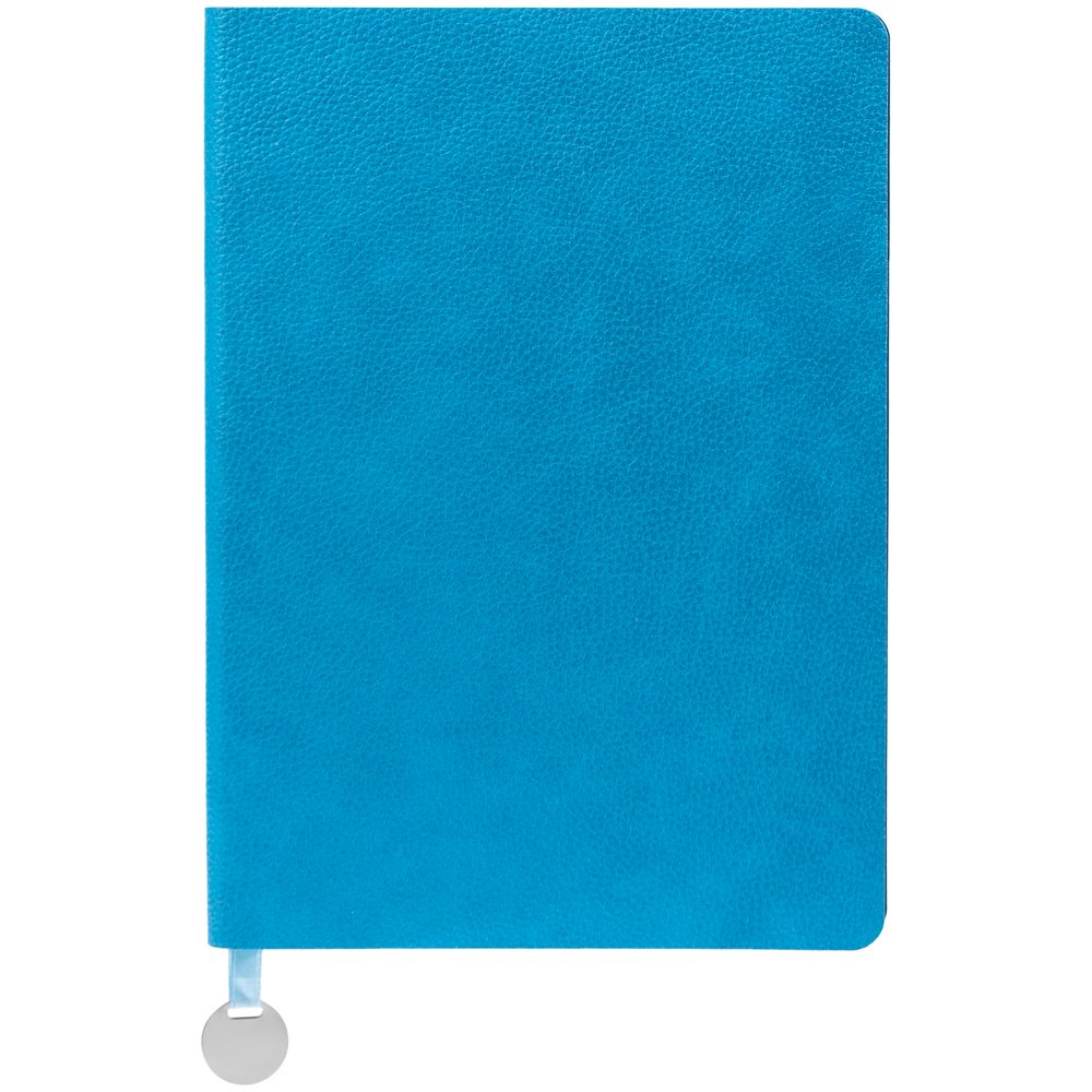 Ежедневник с гибкой обложкой, выполнен из материал La Fite, голубой JJ, дополнен ляссе в цвет обложки с металлическим шильдом.