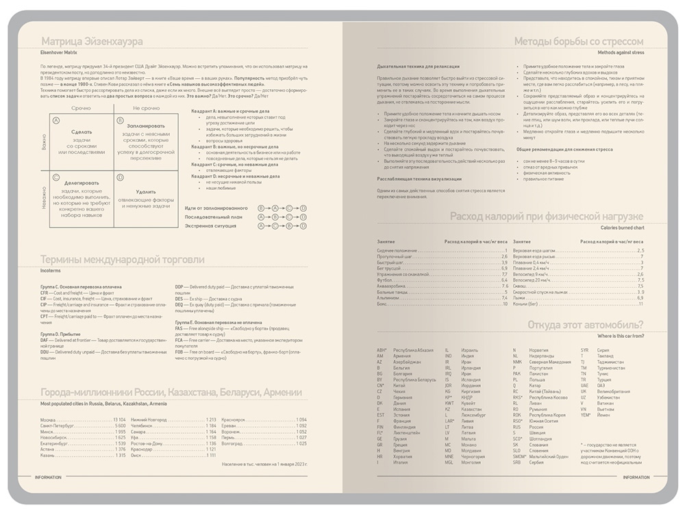 Недатированные страницы в серую линейку имеют отдельное место для проставления числа месяца и дня недели. Справочный блок на 17 страницах содержит полезную информацию из различных областей.