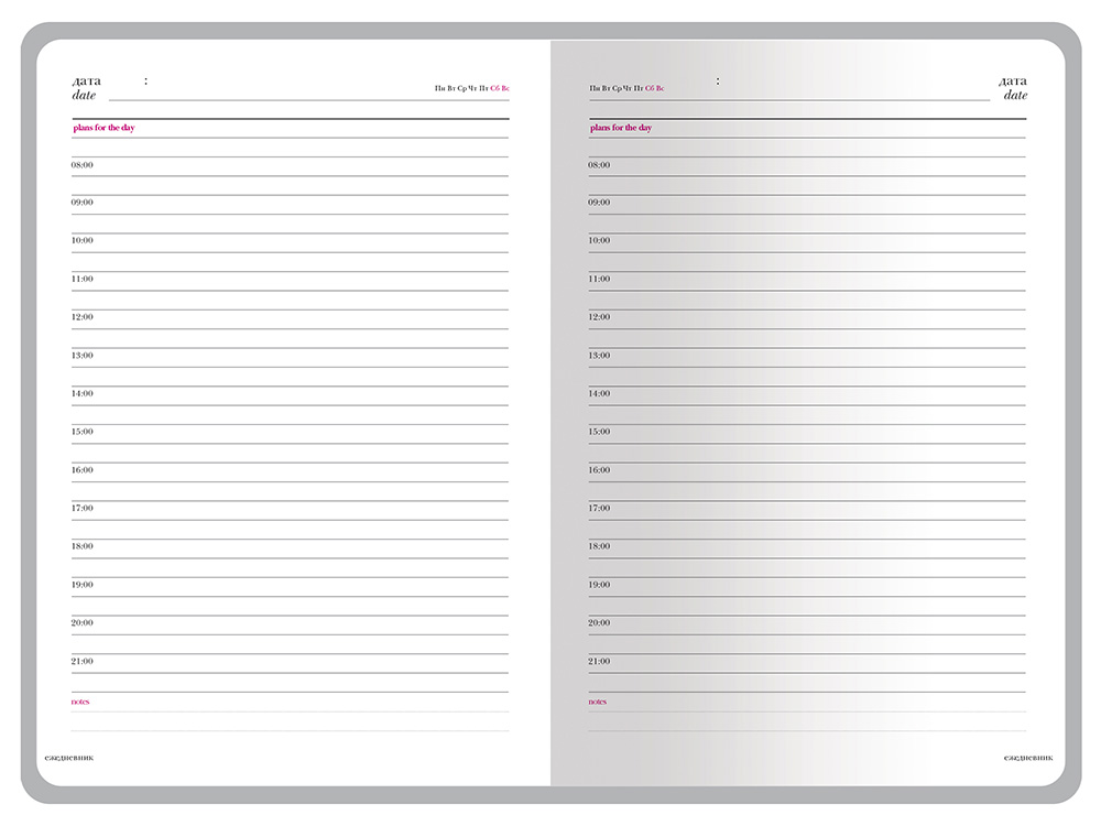 Недатированные страницы в серую линейку имеют отдельное место для проставления числа месяца и дня недели. Справочный блок на 14 страницах содержит полезную информацию из различных областей.