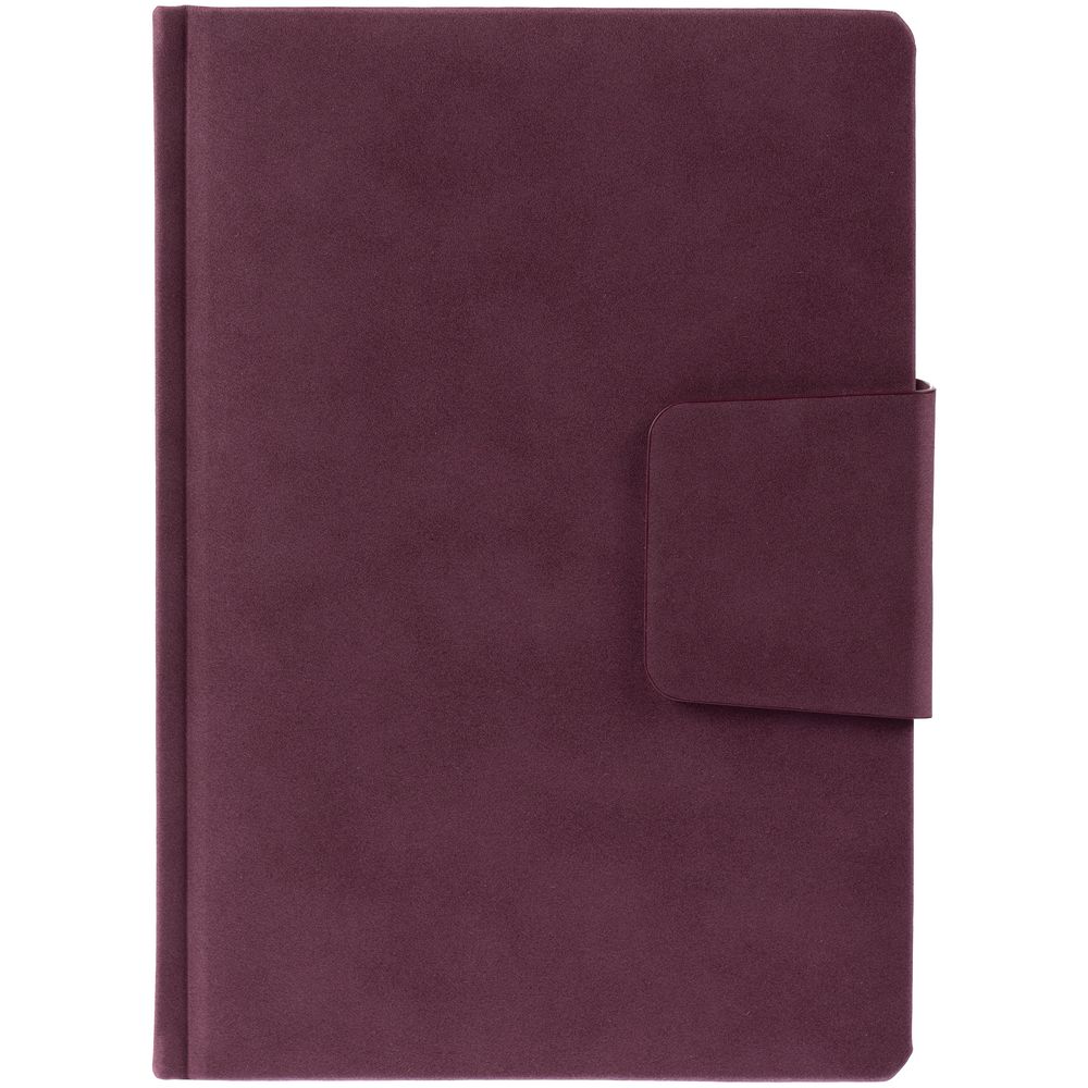 Ежедневник с твердой обложкой c поролоном, выполнен из материала Nubuck, винный SS, дополнен капталом и ляссе бордового цвета. Застежка — хлястик на магните.