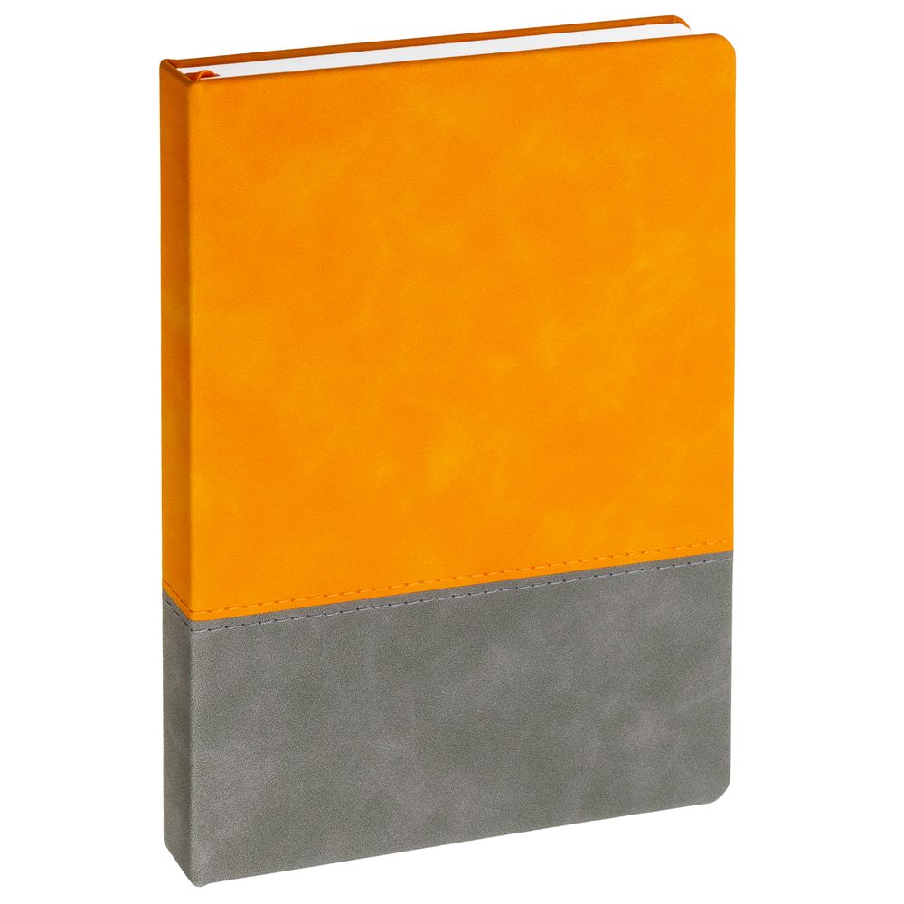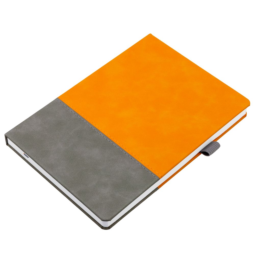 Ежедневник с твердой обложкой, без поролона, со сшивкой материалов Nubuck Touch, серый СС, и Nubuck Touch оранжевый ОО, дополнен двойным ляссе и петлей-резинкой для ручки.