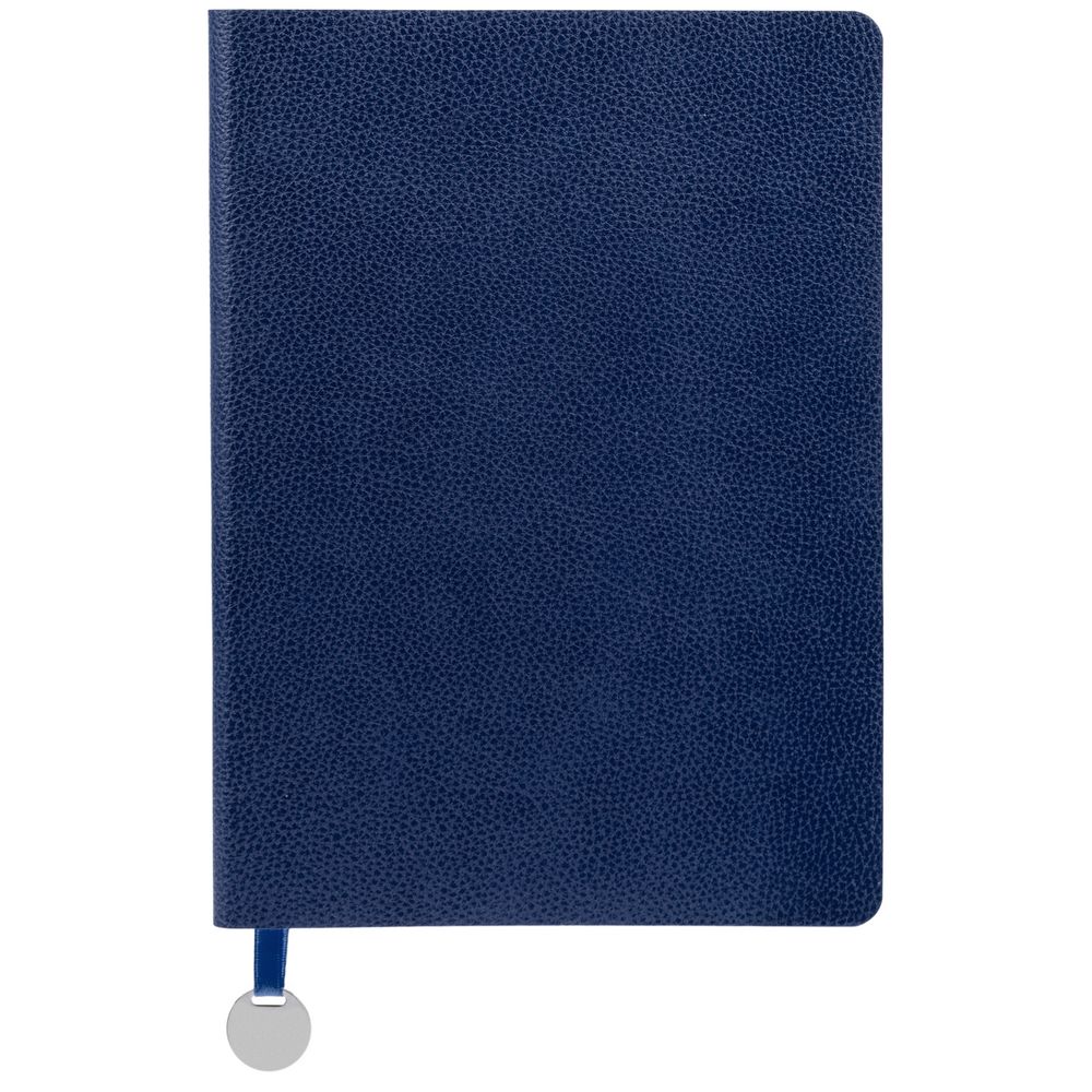 Ежедневник с гибкой обложкой, выполнен из материал La Fite, синий НН, дополнен ляссе в цвет обложки с металлическим шильдом.