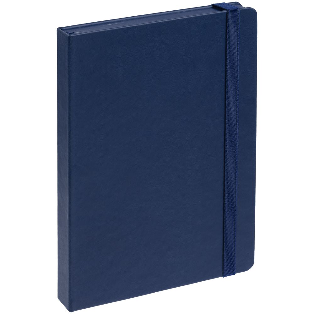 Ежедневник с твердой обложкой, выполнен из материала Latte, темно-синий ХХ, обрез темно-синего цвета, дополнен резинкой и ляссе темно-синего цвета.