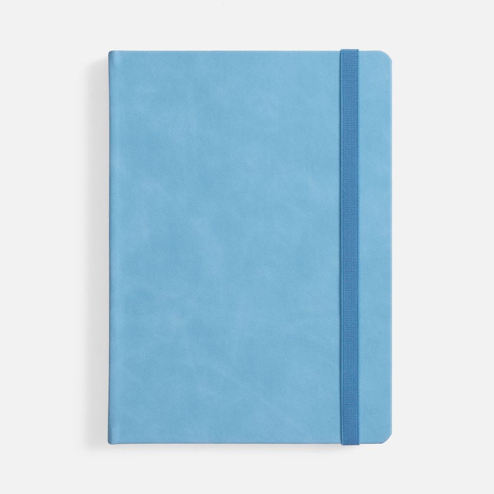 Ежедневник с твердой обложкой, выполнен из материала Nubuck Touch, голубой JJ, дополнен ляссе светло-голубого цвета.