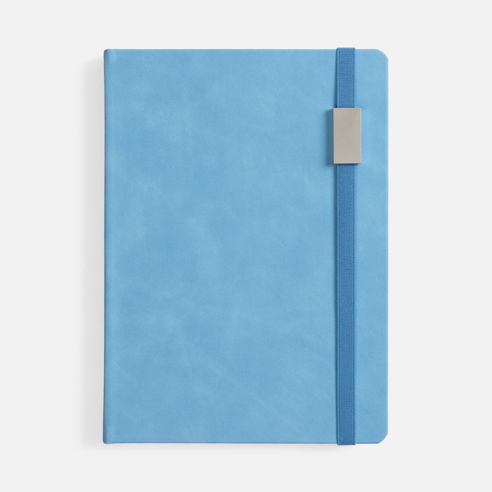 Ежедневник с твердой обложкой, выполнен из материала Nubuck Touch, голубой JJ, дополнен ляссе светло-голубого цвета.