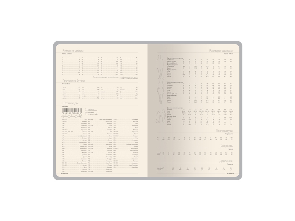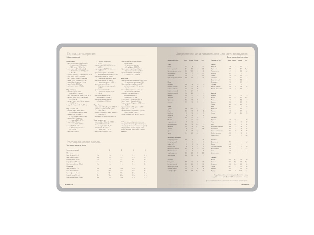 Внутренний блок выполнен из бежевой бумаги плотностью 70 г/кв.м и содержит 14 страниц справочной информации, а также датированные страницы с почасовой разметкой.