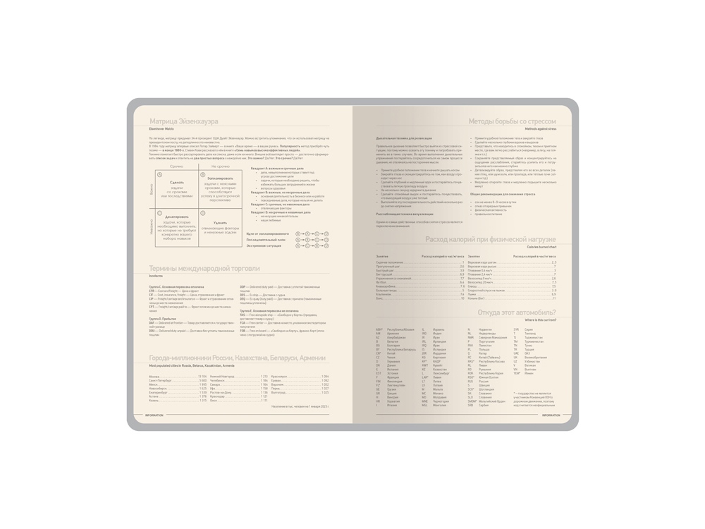 Твердая обложка из фактурной искусственной кожи, двойное ляссе и окрашенный обрез придают ему особый шарм. Блок из бежевой бумаги плотностью 70 г/кв.м содержит раздел для планирования, календарь и справочную информацию.