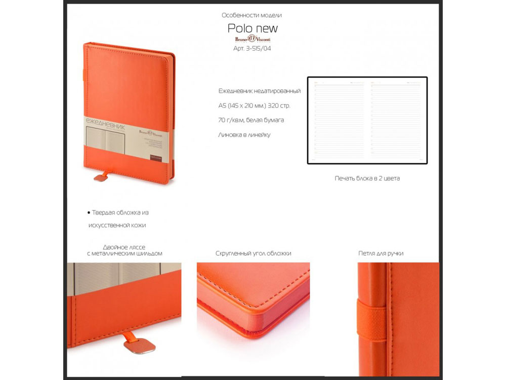 В ежедневнике Polo есть полезная справочная информация, а также 320 страниц для записи идей, мыслей и составления рабочих планов. Для изготовления страниц используется качественный бежевый офсет повышенной плотности (70 г/кв м).