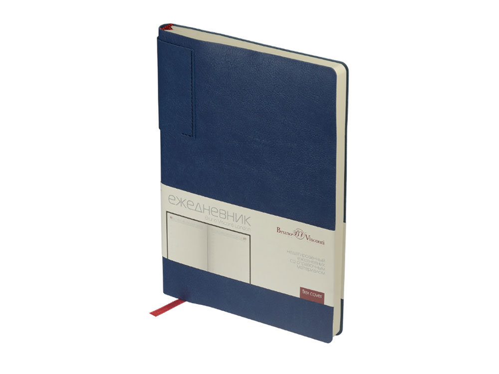 Лаконичная модель в ярком исполнении: гибкая обложка синего цвета с контрастной или в цвет обложки нашивкой. Выполнен из качественной и прочной искусственной кожи, крепление внутреннего блока - книжный переплет, закладка- ляссе. Углы обложки скруглены.