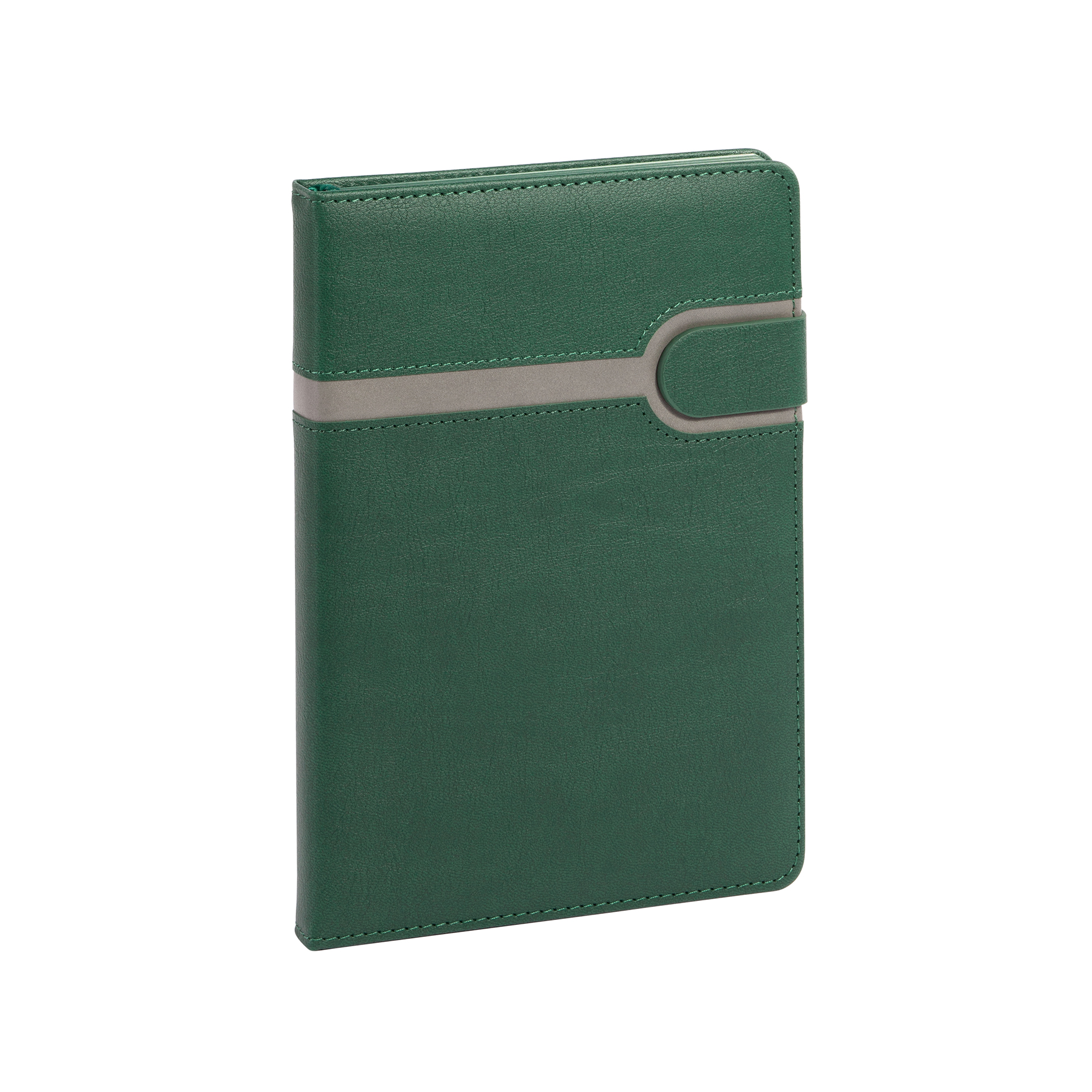 Матовая плотная обложка с выраженной текстурой натуральной кожи дополнена стильным вырезом – полосой серого цвета с прошивкой по периметру. Внутренний блок включает 256 страниц из бумаги плотностью 70 гр., срезом в цвет обложки и закладкой-ляссе, благодаря которой его удобно сразу открывать на нужной странице.