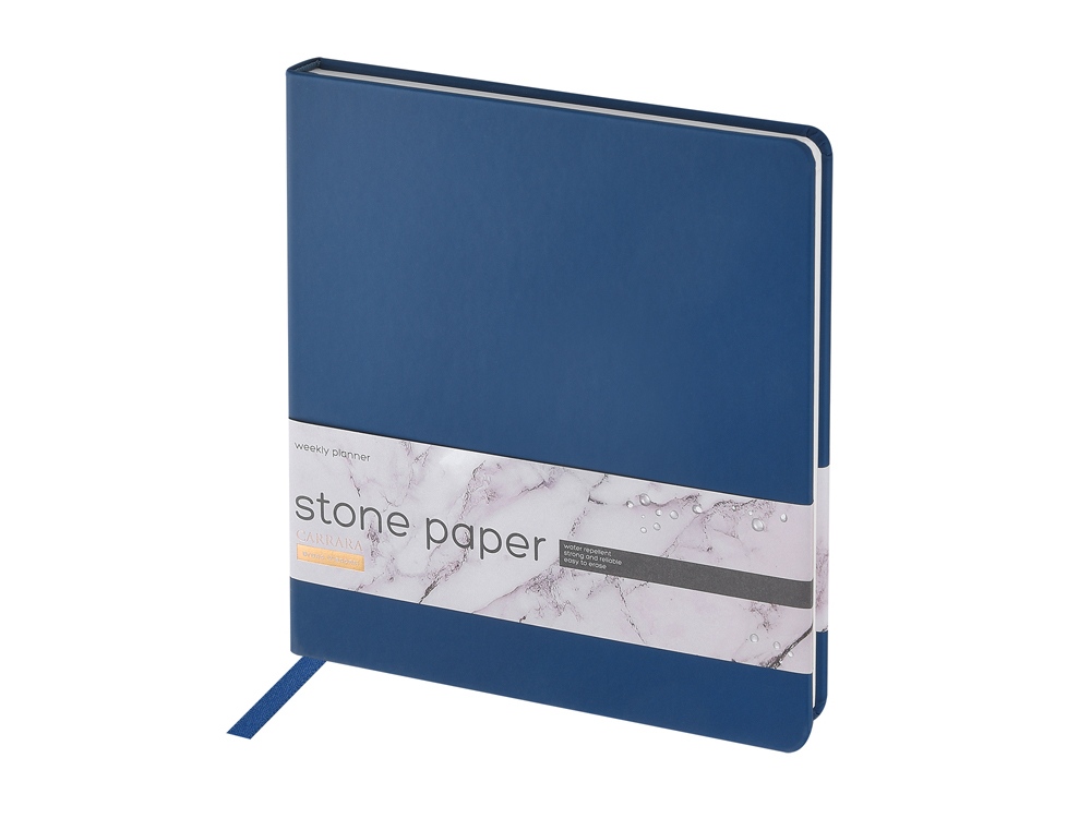 Еженедельник с каменной бумагой А5+ Carrara, темно-синий с логотипом компании - отличный способ заявить вашу корпоративную идентичность.