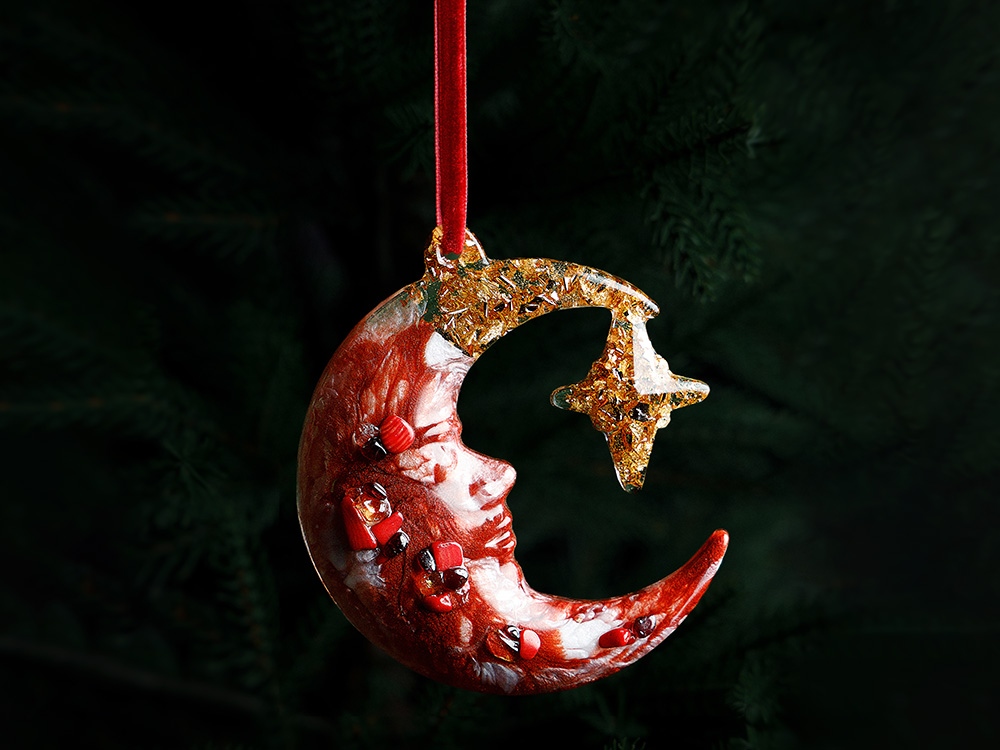 Компания «Эклектика BY» осуществляет нанесение логотипа на сувенирную продукцию: Елочные игрушки (Полумесяц) Гранат. Арт. 445564
