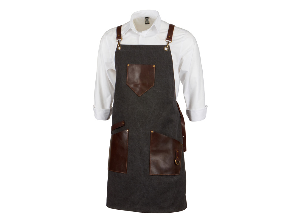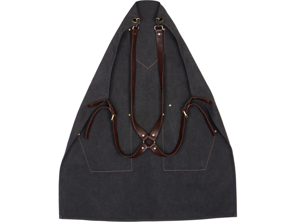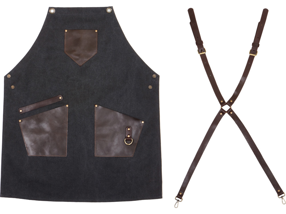 Компания «Эклектика BY» осуществляет нанесение логотипа на сувенирную продукцию: Фартук из канваса с ремнями из натуральной кожи, материал: канвас смесовый, плотность 450 гр/м, натуральная кожа КРС, цвет черный, коричневый темный. Арт. 431314