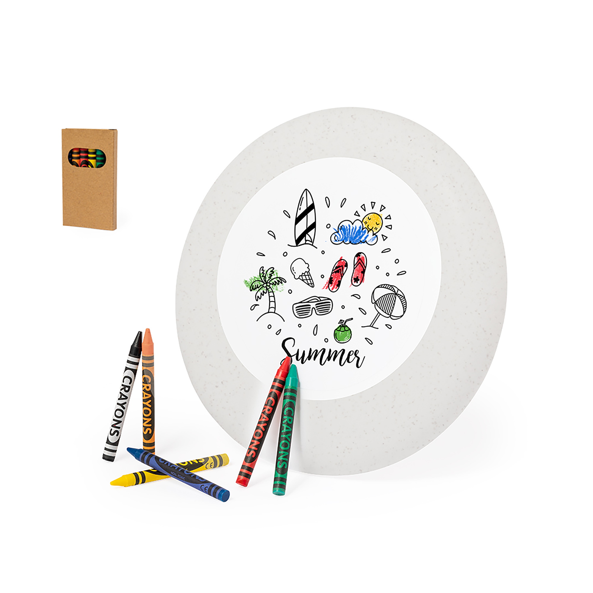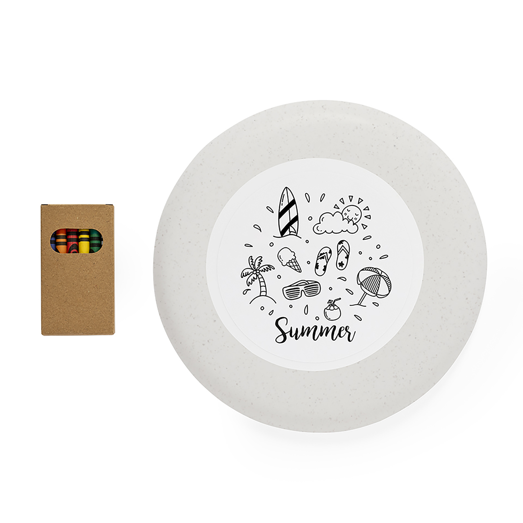 Лето – время ярких красок, веселья и активностей. Новинка – фрисби-раскраска для игр и творчества. 6 восковых карандашей в комплекте, яркие оттенки для создания авторской тарелки. Простая активная игра для 2 и более человек, идеальна для прогулок, пикников, дней рождения и отдыха на пляже. Восковые карандаши безопасны, не пачкают одежду, корпус тарелки изготовлен из пластика с добавлением растительных волокон.