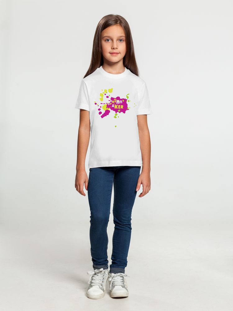 Главная ->Корпоративные подарки и рекламные сувениры на складе -> Promo одежда и аксессуары -> Детский текстиль -> Футболка детская «Пятно Maker», белая, на рост 96-104 см (4 года)