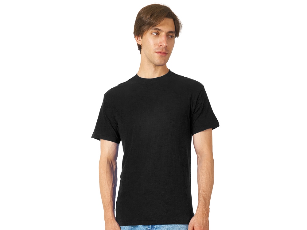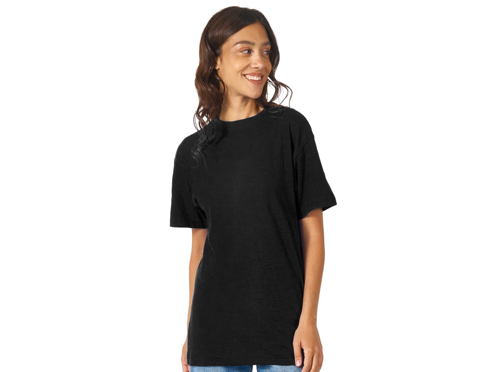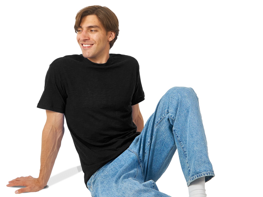 Полотно футболки имеет необычную структуру - с протяжками, но при этом гладкую поверхность, что обеспечивает идеальную поверхность для нанесения: прямая печать, трафаретная или термотрансфер прекрасно ложатся на такое полотно. Декоративная отстрочка по низу рукавов и изделия, а также отстрочка по горловине позволяют футболке дольше сохранять форму.
