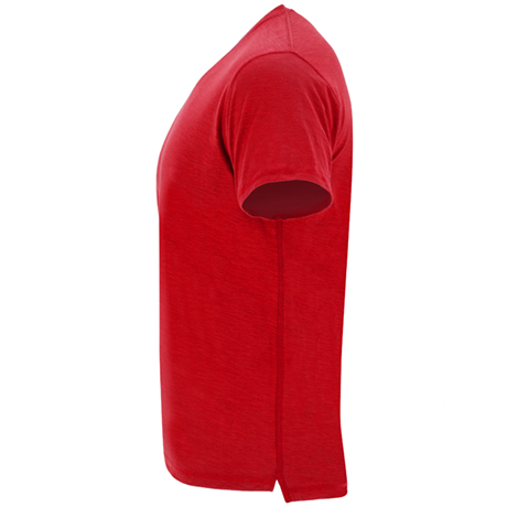 Футболка с короткими рукавами меланжевого цвета и асимметричным низом. Круглая горловина из той же ткани, украшенная оверлочным швом. Контрастные закрытые внутренние плечевые швы. Боковые швы, украшенные оверлочным швом. Боковые разрезы снизу. Спинка немного длиннее переда.