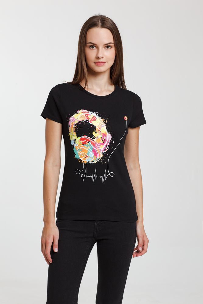 Главная ->Корпоративные подарки и рекламные сувениры на складе -> Promo одежда и аксессуары -> Футболки с принтом -> Футболка женская Feel The Beat, черная, размер L